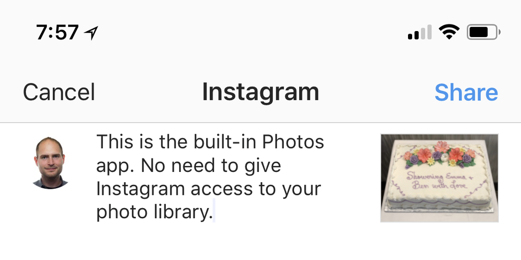 You can send it directly to Instagram, without granting access to your entire library.