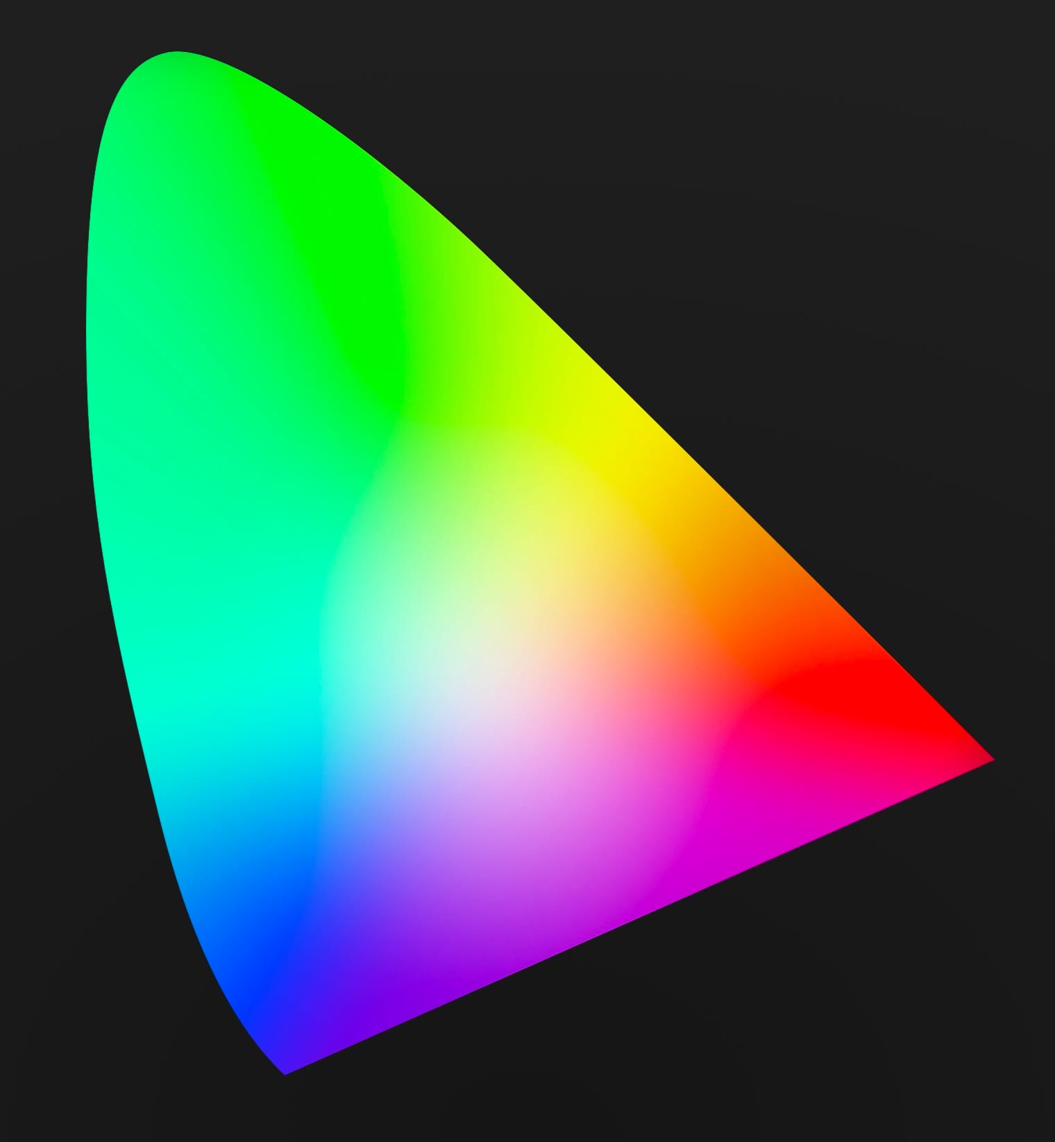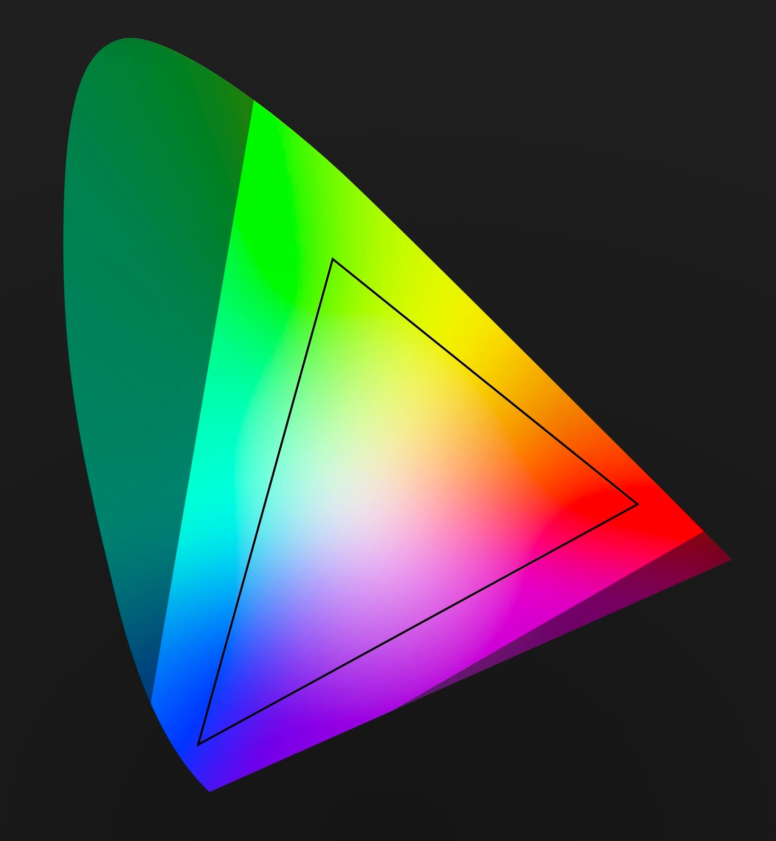 That triangle covers the range of colors computer screens could display for decades. Today screens can display a bit more color, but we're often beholden to this limited range, due to backward compatibility.
