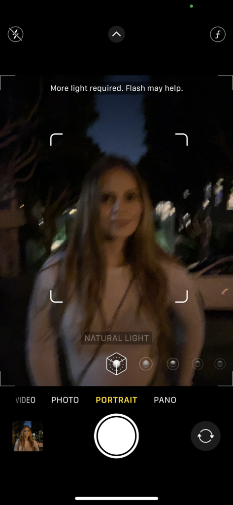 In very low light, the Night mode Portrait feature actually goes from rapid blinking to ‘holding’ the LIDAR projection for a moment at higher brightness to ensure it gets sharp frames and, presumably, a better depth map. I would imagine detecting depth with the two cameras is much harder when there isn’t enough light to really see any parallax.