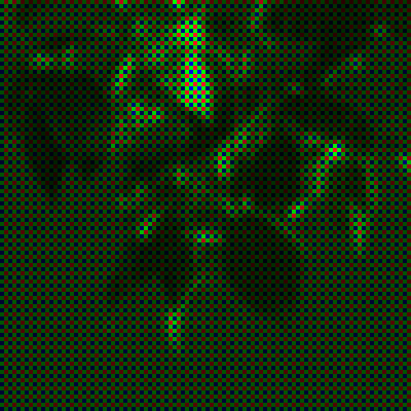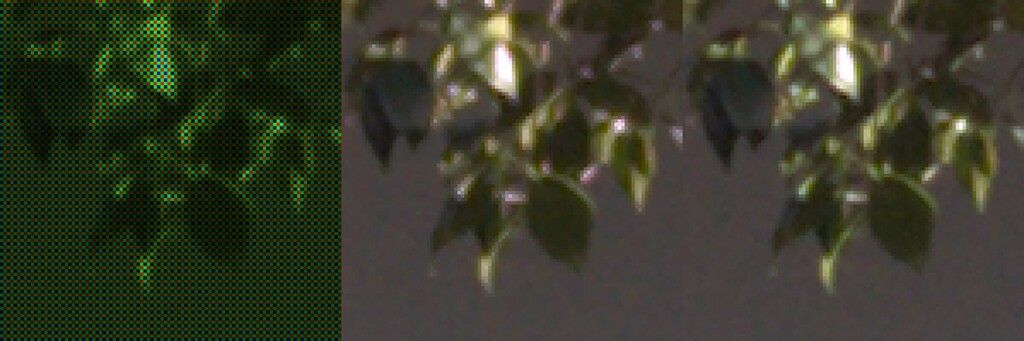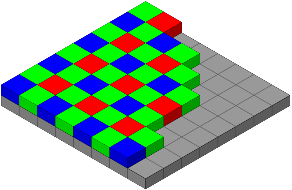 Each pixel is either red, green or blue. We figure out the real colors by going over every pixel, looking at its neighbors, and guessing its two missing colors. This crucial step is known as “demosaicing,” or “debayering.”