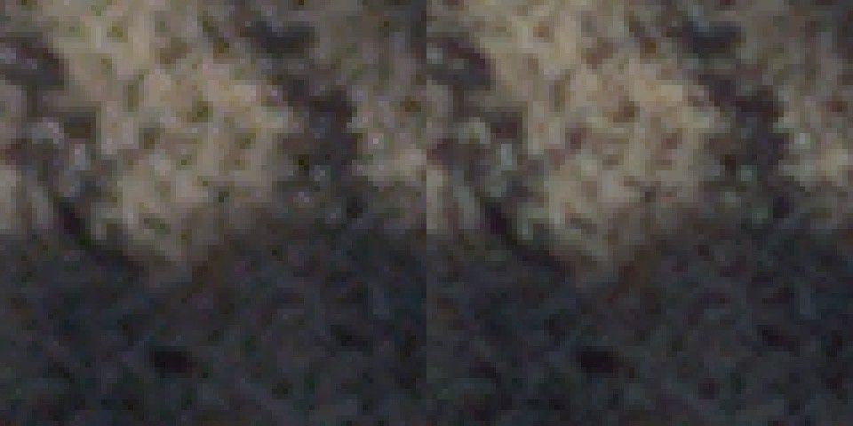 Look at the pebbles in the shot. The fast algorithm is a little more “pixely.”