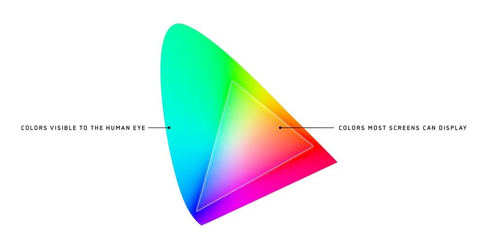 Let’s start with color. The following chart represents all the colors a human can see, and the triangle in the middle covers what most screens can display.
