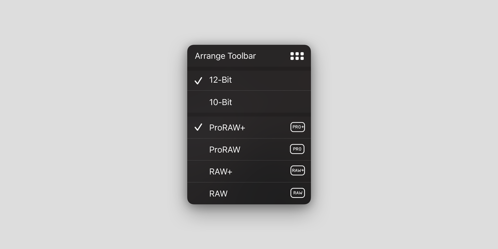 As we beta tested our ProRAW support, it became obvious we had to make it easer to fiddle with capture settings without diving into Settings. Enter the new format picker menu. Just long-press on the RAW button, and you’ll be able to choose between RAW and ProRAW, your desired bit-depth, and whether you wish to save the processed version alongside your DNG.