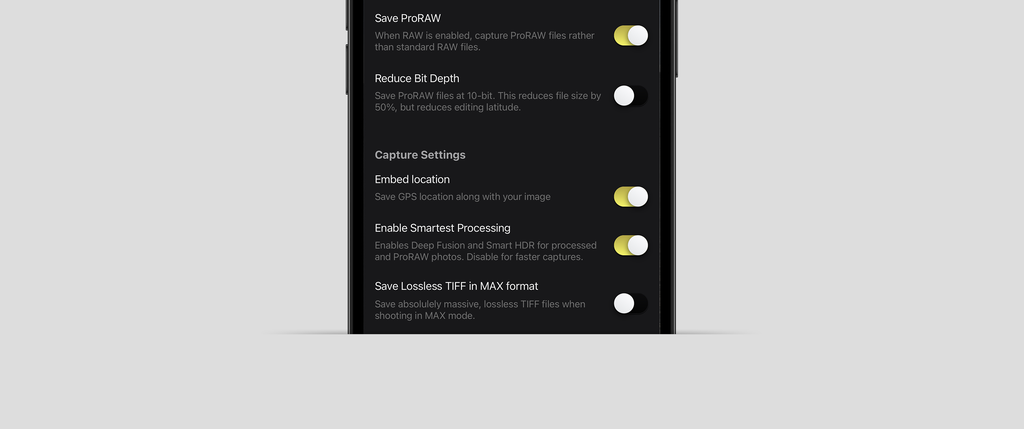We also ensure to remember and persist your ProRAW settings. With great power comes great iCloud consumption, so please use this responsibly.
